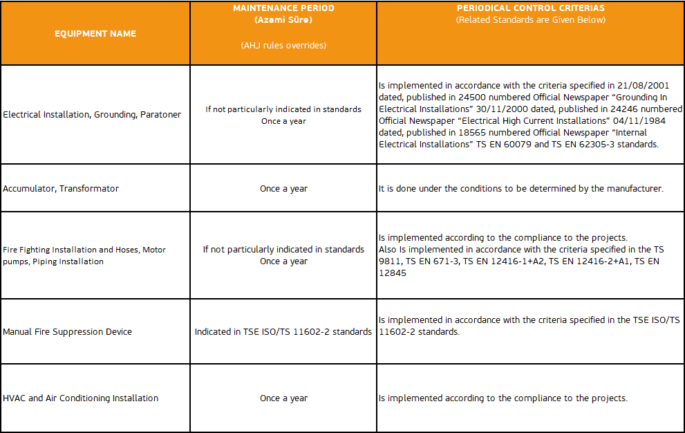 Below table shows periodical maintenance for critical systems. These service and maintenance must be controlled by certified engineers.